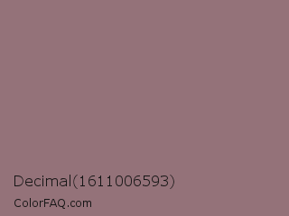 Decimal 1611006593 Color is a normal red color and the nearest color is Bazaar #98777b. Hex code #947279 and RGB value is rgb(148,114,121). In RGB color space, this color is composed of 58% red, 45% green, 47% blue, In CMYK color space, this color is composed of 0% cyan, 23% magenta, 18% yellow , 42% black , In HSL color space, this color has a hue angle of 348° , 14% saturation and 51% lightness.