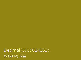 Decimal 1611024262 Color is a normal yellow color and the nearest color is Dark Yellow #9b870c. Hex code #948412 and RGB value is rgb(148,132,18). In RGB color space, this color is composed of 58% red, 52% green, 7% blue, In CMYK color space, this color is composed of 0% cyan, 11% magenta, 88% yellow , 42% black , In HSL color space, this color has a hue angle of 53° , 78% saturation and 33% lightness.