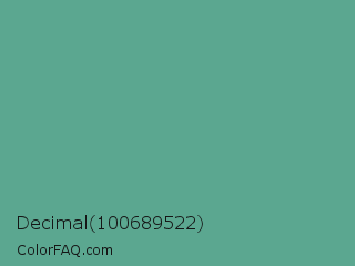 Decimal 100689522 Color is a normal green color and the nearest color is Polished Pine #5da493. Hex code #5ba790 and RGB value is rgb(91,167,144). In RGB color space, this color is composed of 36% red, 65% green, 56% blue, In CMYK color space, this color is composed of 46% cyan, 0% magenta, 14% yellow , 35% black , In HSL color space, this color has a hue angle of 162° , 30% saturation and 51% lightness.
