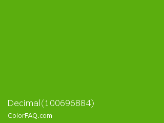 Decimal 100696884 Color is a normal green color and the nearest color is Christi #67a712. Hex code #5bae0e and RGB value is rgb(91,174,14). In RGB color space, this color is composed of 36% red, 68% green, 5% blue, In CMYK color space, this color is composed of 48% cyan, 0% magenta, 92% yellow , 32% black , In HSL color space, this color has a hue angle of 91° , 85% saturation and 37% lightness.
