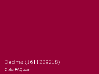 Decimal 1611229218 Color is a dark rose color and the nearest color is Pink Raspberry #980036. Hex code #950136 and RGB value is rgb(149,1,54). In RGB color space, this color is composed of 58% red, 0% green, 21% blue, In CMYK color space, this color is composed of 0% cyan, 99% magenta, 64% yellow , 42% black , In HSL color space, this color has a hue angle of 339° , 99% saturation and 29% lightness.