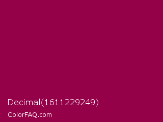 Decimal 1611229249 Color is a dark rose color and the nearest color is Pink Raspberry #980036. Hex code #950149 and RGB value is rgb(149,1,73). In RGB color space, this color is composed of 58% red, 0% green, 29% blue, In CMYK color space, this color is composed of 0% cyan, 99% magenta, 51% yellow , 42% black , In HSL color space, this color has a hue angle of 331° , 99% saturation and 29% lightness.