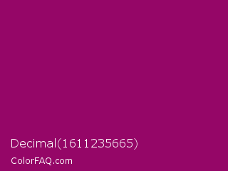 Decimal 1611235665 Color is a dark magenta color and the nearest color is Fresh Eggplant #990066. Hex code #950667 and RGB value is rgb(149,6,103). In RGB color space, this color is composed of 58% red, 2% green, 40% blue, In CMYK color space, this color is composed of 0% cyan, 96% magenta, 31% yellow , 42% black , In HSL color space, this color has a hue angle of 319° , 92% saturation and 30% lightness.