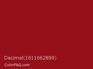 Decimal 1611662899 Color is a normal red color and the nearest color is Ruby Red #9b111e. Hex code #951019 and RGB value is rgb(149,16,25). In RGB color space, this color is composed of 58% red, 6% green, 10% blue, In CMYK color space, this color is composed of 0% cyan, 89% magenta, 83% yellow , 42% black , In HSL color space, this color has a hue angle of 356° , 81% saturation and 32% lightness.