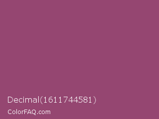 Decimal 1611744581 Color is a normal magenta color and the nearest color is Sugar Plum #914e75. Hex code #954671 and RGB value is rgb(149,70,113). In RGB color space, this color is composed of 58% red, 27% green, 44% blue, In CMYK color space, this color is composed of 0% cyan, 53% magenta, 24% yellow , 42% black , In HSL color space, this color has a hue angle of 327° , 36% saturation and 43% lightness.