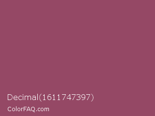 Decimal 1611747397 Color is a normal rose color and the nearest color is Vin Rouge #983d61. Hex code #954865 and RGB value is rgb(149,72,101). In RGB color space, this color is composed of 58% red, 28% green, 40% blue, In CMYK color space, this color is composed of 0% cyan, 52% magenta, 32% yellow , 42% black , In HSL color space, this color has a hue angle of 337° , 35% saturation and 43% lightness.