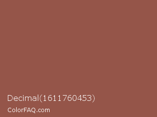 Decimal 1611760453 Color is a normal red color and the nearest color is Coconut #965a3e. Hex code #955549 and RGB value is rgb(149,85,73). In RGB color space, this color is composed of 58% red, 33% green, 29% blue, In CMYK color space, this color is composed of 0% cyan, 43% magenta, 51% yellow , 42% black , In HSL color space, this color has a hue angle of 9° , 34% saturation and 44% lightness.