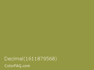 Decimal 1611879568 Color is a normal yellow color and the nearest color is Sycamore #908d39. Hex code #959842 and RGB value is rgb(149,152,66). In RGB color space, this color is composed of 58% red, 60% green, 26% blue, In CMYK color space, this color is composed of 2% cyan, 0% magenta, 57% yellow , 40% black , In HSL color space, this color has a hue angle of 62° , 39% saturation and 43% lightness.