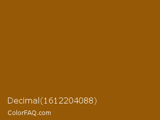 Decimal 1612204088 Color is a normal orange color and the nearest color is Chelsea Gem #9e5302. Hex code #965906 and RGB value is rgb(150,89,6). In RGB color space, this color is composed of 59% red, 35% green, 2% blue, In CMYK color space, this color is composed of 0% cyan, 41% magenta, 96% yellow , 41% black , In HSL color space, this color has a hue angle of 35° , 92% saturation and 31% lightness.