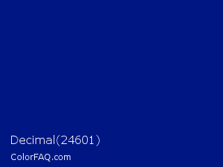 Decimal 24601 Color is a dark blue color and the nearest color is Dark Imperial Blue #00147e. Hex code #001783 and RGB value is rgb(0,23,131). In RGB color space, this color is composed of 0% red, 9% green, 51% blue, In CMYK color space, this color is composed of 100% cyan, 82% magenta, 0% yellow , 49% black , In HSL color space, this color has a hue angle of 229° , 100% saturation and 26% lightness.