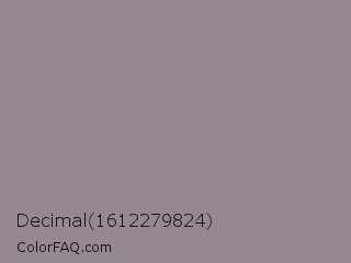 Decimal 1612279824 Color is a normal magenta color and the nearest color is Venus #928590. Hex code #968892 and RGB value is rgb(150,136,146). In RGB color space, this color is composed of 59% red, 53% green, 57% blue, In CMYK color space, this color is composed of 0% cyan, 9% magenta, 3% yellow , 41% black , In HSL color space, this color has a hue angle of 317° , 6% saturation and 56% lightness.