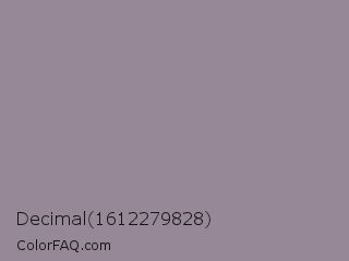 Decimal 1612279828 Color is a normal magenta color and the nearest color is Venus #928590. Hex code #968896 and RGB value is rgb(150,136,150). In RGB color space, this color is composed of 59% red, 53% green, 59% blue, In CMYK color space, this color is composed of 0% cyan, 9% magenta, 0% yellow , 41% black , In HSL color space, this color has a hue angle of 300° , 6% saturation and 56% lightness.