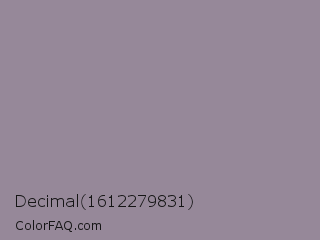 Decimal 1612279831 Color is a normal purple color and the nearest color is Venus #928590. Hex code #968899 and RGB value is rgb(150,136,153). In RGB color space, this color is composed of 59% red, 53% green, 60% blue, In CMYK color space, this color is composed of 2% cyan, 11% magenta, 0% yellow , 40% black , In HSL color space, this color has a hue angle of 289° , 8% saturation and 57% lightness.