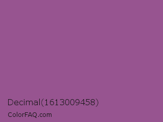 Decimal 1613009458 Color is a normal magenta color and the nearest color is Razzmic Berry #8d4e85. Hex code #975490 and RGB value is rgb(151,84,144). In RGB color space, this color is composed of 59% red, 33% green, 56% blue, In CMYK color space, this color is composed of 0% cyan, 44% magenta, 5% yellow , 41% black , In HSL color space, this color has a hue angle of 306° , 29% saturation and 46% lightness.