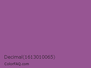 Decimal 1613010065 Color is a normal magenta color and the nearest color is Antique Fuchsia #915c83. Hex code #975593 and RGB value is rgb(151,85,147). In RGB color space, this color is composed of 59% red, 33% green, 58% blue, In CMYK color space, this color is composed of 0% cyan, 44% magenta, 3% yellow , 41% black , In HSL color space, this color has a hue angle of 304° , 28% saturation and 46% lightness.