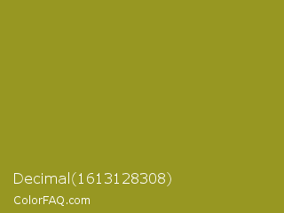 Decimal 1613128308 Color is a normal yellow color and the nearest color is Citron #9fa91f. Hex code #979722 and RGB value is rgb(151,151,34). In RGB color space, this color is composed of 59% red, 59% green, 13% blue, In CMYK color space, this color is composed of 0% cyan, 0% magenta, 77% yellow , 41% black , In HSL color space, this color has a hue angle of 60° , 63% saturation and 36% lightness.