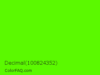 Decimal 100824352 Color is a normal green color and the nearest color is Bright Green #66ff00. Hex code #5bf900 and RGB value is rgb(91,249,0). In RGB color space, this color is composed of 36% red, 98% green, 0% blue, In CMYK color space, this color is composed of 63% cyan, 0% magenta, 100% yellow , 2% black , In HSL color space, this color has a hue angle of 98° , 100% saturation and 49% lightness.