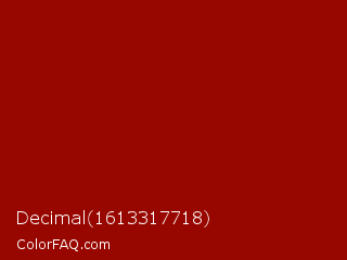 Decimal 1613317718 Color is a dark red color and the nearest color is Crimson Red #990000. Hex code #980600 and RGB value is rgb(152,6,0). In RGB color space, this color is composed of 60% red, 2% green, 0% blue, In CMYK color space, this color is composed of 0% cyan, 96% magenta, 100% yellow , 40% black , In HSL color space, this color has a hue angle of 2° , 100% saturation and 30% lightness.