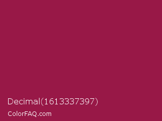 Decimal 1613337397 Color is a normal rose color and the nearest color is Big Dip O Ruby #9c2542. Hex code #981847 and RGB value is rgb(152,24,71). In RGB color space, this color is composed of 60% red, 9% green, 28% blue, In CMYK color space, this color is composed of 0% cyan, 84% magenta, 53% yellow , 40% black , In HSL color space, this color has a hue angle of 338° , 73% saturation and 35% lightness.