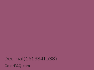 Decimal 1613841538 Color is a normal rose color and the nearest color is Sugar Plum #914e75. Hex code #985372 and RGB value is rgb(152,83,114). In RGB color space, this color is composed of 60% red, 33% green, 45% blue, In CMYK color space, this color is composed of 0% cyan, 45% magenta, 25% yellow , 40% black , In HSL color space, this color has a hue angle of 333° , 29% saturation and 46% lightness.