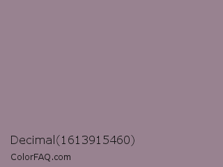 Decimal 1613915460 Color is a normal magenta color and the nearest color is Venus #928590. Hex code #988290 and RGB value is rgb(152,130,144). In RGB color space, this color is composed of 60% red, 51% green, 56% blue, In CMYK color space, this color is composed of 0% cyan, 14% magenta, 5% yellow , 40% black , In HSL color space, this color has a hue angle of 322° , 10% saturation and 55% lightness.