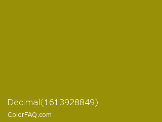 Decimal 1613928849 Color is a normal yellow color and the nearest color is Dark Yellow #9b870c. Hex code #989007 and RGB value is rgb(152,144,7). In RGB color space, this color is composed of 60% red, 56% green, 3% blue, In CMYK color space, this color is composed of 0% cyan, 5% magenta, 95% yellow , 40% black , In HSL color space, this color has a hue angle of 57° , 91% saturation and 31% lightness.