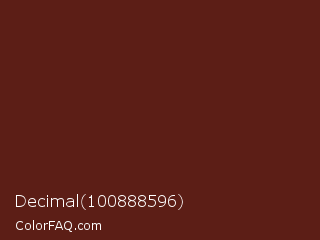 Decimal 100888596 Color is a very dark red color and the nearest color is Redwood #5d1e0f. Hex code #5c1e16 and RGB value is rgb(92,30,22). In RGB color space, this color is composed of 36% red, 12% green, 9% blue, In CMYK color space, this color is composed of 0% cyan, 67% magenta, 76% yellow , 64% black , In HSL color space, this color has a hue angle of 7° , 61% saturation and 22% lightness.