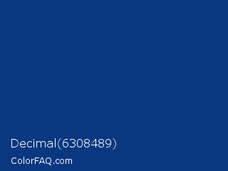 Decimal 6308489 Color is a dark blue color and the nearest color is Dark Cerulean #08457e. Hex code #093881 and RGB value is rgb(9,56,129). In RGB color space, this color is composed of 4% red, 22% green, 51% blue, In CMYK color space, this color is composed of 93% cyan, 57% magenta, 0% yellow , 49% black , In HSL color space, this color has a hue angle of 217° , 87% saturation and 27% lightness.