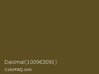 Decimal 100963091 Color is a dark yellow color and the nearest color is West Coast #625119. Hex code #5c4e21 and RGB value is rgb(92,78,33). In RGB color space, this color is composed of 36% red, 31% green, 13% blue, In CMYK color space, this color is composed of 0% cyan, 15% magenta, 64% yellow , 64% black , In HSL color space, this color has a hue angle of 46° , 47% saturation and 25% lightness.