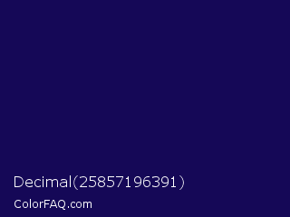 Decimal 25857196391 Color is a very dark indigo color and the nearest color is Tolopea #1b0245. Hex code #150857 and RGB value is rgb(21,8,87). In RGB color space, this color is composed of 8% red, 3% green, 34% blue, In CMYK color space, this color is composed of 76% cyan, 91% magenta, 0% yellow , 66% black , In HSL color space, this color has a hue angle of 250° , 83% saturation and 19% lightness.