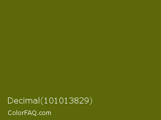 Decimal 101013829 Color is a very dark yellow color and the nearest color is Saratoga #555b10. Hex code #5c6809 and RGB value is rgb(92,104,9). In RGB color space, this color is composed of 36% red, 41% green, 4% blue, In CMYK color space, this color is composed of 12% cyan, 0% magenta, 91% yellow , 59% black , In HSL color space, this color has a hue angle of 68° , 84% saturation and 22% lightness.