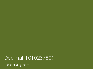 Decimal 101023780 Color is a dark lime color and the nearest color is Dark Olive Green #556b2f. Hex code #5c7028 and RGB value is rgb(92,112,40). In RGB color space, this color is composed of 36% red, 44% green, 16% blue, In CMYK color space, this color is composed of 18% cyan, 0% magenta, 64% yellow , 56% black , In HSL color space, this color has a hue angle of 77° , 47% saturation and 30% lightness.