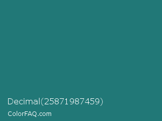 Decimal 25871987459 Color is a dark cyan color and the nearest color is Elm #1c7c7d. Hex code #217877 and RGB value is rgb(33,120,119). In RGB color space, this color is composed of 13% red, 47% green, 47% blue, In CMYK color space, this color is composed of 73% cyan, 0% magenta, 1% yellow , 53% black , In HSL color space, this color has a hue angle of 179° , 57% saturation and 30% lightness.