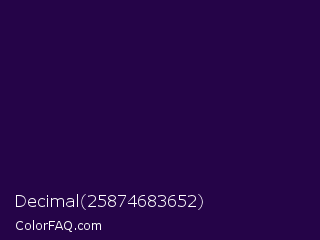 Decimal 25874683652 Color is a very dark violet color and the nearest color is Violet #240a40. Hex code #250448 and RGB value is rgb(37,4,72). In RGB color space, this color is composed of 15% red, 2% green, 28% blue, In CMYK color space, this color is composed of 49% cyan, 94% magenta, 0% yellow , 72% black , In HSL color space, this color has a hue angle of 269° , 89% saturation and 15% lightness.