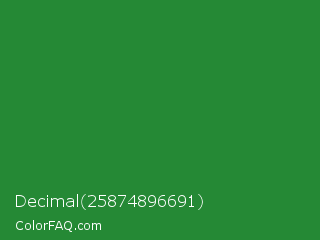 Decimal 25874896691 Color is a normal green color and the nearest color is Forest Green #228b22. Hex code #258935 and RGB value is rgb(37,137,53). In RGB color space, this color is composed of 15% red, 54% green, 21% blue, In CMYK color space, this color is composed of 73% cyan, 0% magenta, 61% yellow , 46% black , In HSL color space, this color has a hue angle of 130° , 57% saturation and 34% lightness.