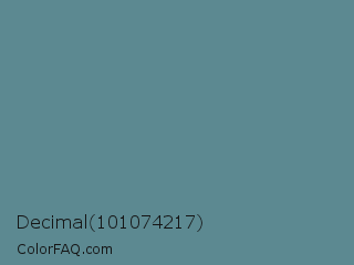 Decimal 101074217 Color is a normal cyan color and the nearest color is Steel Teal #5f8a8b. Hex code #5c8991 and RGB value is rgb(92,137,145). In RGB color space, this color is composed of 36% red, 54% green, 57% blue, In CMYK color space, this color is composed of 37% cyan, 6% magenta, 0% yellow , 43% black , In HSL color space, this color has a hue angle of 189° , 22% saturation and 46% lightness.