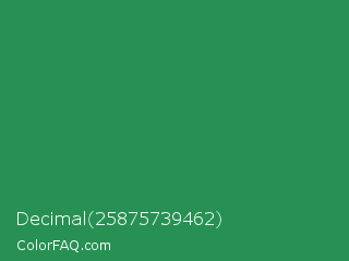 Decimal 25875739462 Color is a normal green color and the nearest color is Sea Green #2e8b57. Hex code #269152 and RGB value is rgb(38,145,82). In RGB color space, this color is composed of 15% red, 57% green, 32% blue, In CMYK color space, this color is composed of 74% cyan, 0% magenta, 43% yellow , 43% black , In HSL color space, this color has a hue angle of 145° , 58% saturation and 36% lightness.
