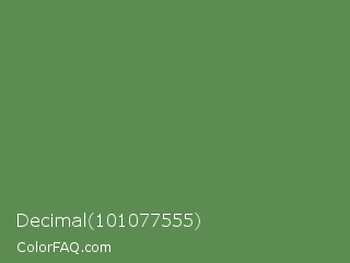 Decimal 101077555 Color is a normal green color and the nearest color is Hippie Green #53824b. Hex code #5c8c51 and RGB value is rgb(92,140,81). In RGB color space, this color is composed of 36% red, 55% green, 32% blue, In CMYK color space, this color is composed of 34% cyan, 0% magenta, 42% yellow , 45% black , In HSL color space, this color has a hue angle of 109° , 27% saturation and 43% lightness.