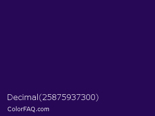 Decimal 25875937300 Color is a very dark violet color and the nearest color is Cherry Pie #2a0359. Hex code #270856 and RGB value is rgb(39,8,86). In RGB color space, this color is composed of 15% red, 3% green, 34% blue, In CMYK color space, this color is composed of 55% cyan, 91% magenta, 0% yellow , 66% black , In HSL color space, this color has a hue angle of 264° , 83% saturation and 18% lightness.