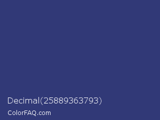 Decimal 25889363793 Color is a normal blue color and the nearest color is Astronaut #283a77. Hex code #313977 and RGB value is rgb(49,57,119). In RGB color space, this color is composed of 19% red, 22% green, 47% blue, In CMYK color space, this color is composed of 59% cyan, 52% magenta, 0% yellow , 53% black , In HSL color space, this color has a hue angle of 233° , 42% saturation and 33% lightness.