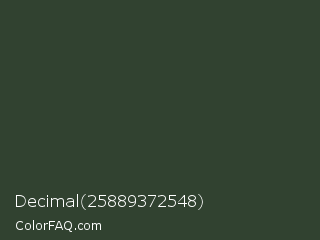 Decimal 25889372548 Color is a very dark green color and the nearest color is Kombu Green #354230. Hex code #314230 and RGB value is rgb(49,66,48). In RGB color space, this color is composed of 19% red, 26% green, 19% blue, In CMYK color space, this color is composed of 26% cyan, 0% magenta, 27% yellow , 74% black , In HSL color space, this color has a hue angle of 117° , 16% saturation and 22% lightness.