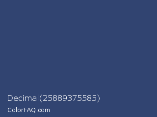 Decimal 25889375585 Color is a normal blue color and the nearest color is San Juan #304b6a. Hex code #314471 and RGB value is rgb(49,68,113). In RGB color space, this color is composed of 19% red, 27% green, 44% blue, In CMYK color space, this color is composed of 57% cyan, 40% magenta, 0% yellow , 56% black , In HSL color space, this color has a hue angle of 222° , 40% saturation and 32% lightness.