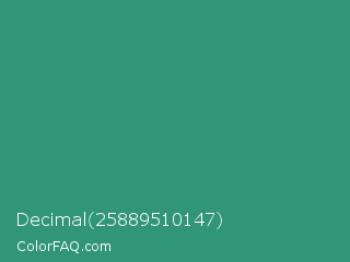 Decimal 25889510147 Color is a normal green color and the nearest color is Illuminating Emerald #319177. Hex code #319577 and RGB value is rgb(49,149,119). In RGB color space, this color is composed of 19% red, 58% green, 47% blue, In CMYK color space, this color is composed of 67% cyan, 0% magenta, 20% yellow , 42% black , In HSL color space, this color has a hue angle of 162° , 51% saturation and 39% lightness.