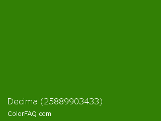 Decimal 25889903433 Color is a dark green color and the nearest color is Napier Green #2a8000. Hex code #328005 and RGB value is rgb(50,128,5). In RGB color space, this color is composed of 20% red, 50% green, 2% blue, In CMYK color space, this color is composed of 61% cyan, 0% magenta, 96% yellow , 50% black , In HSL color space, this color has a hue angle of 98° , 92% saturation and 26% lightness.