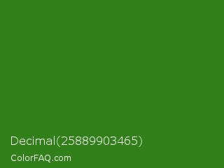 Decimal 25889903465 Color is a dark green color and the nearest color is Bilbao #327c14. Hex code #328019 and RGB value is rgb(50,128,25). In RGB color space, this color is composed of 20% red, 50% green, 10% blue, In CMYK color space, this color is composed of 61% cyan, 0% magenta, 80% yellow , 50% black , In HSL color space, this color has a hue angle of 105° , 67% saturation and 30% lightness.