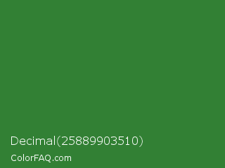 Decimal 25889903510 Color is a normal green color and the nearest color is Forest Green #228b22. Hex code #328034 and RGB value is rgb(50,128,52). In RGB color space, this color is composed of 20% red, 50% green, 20% blue, In CMYK color space, this color is composed of 61% cyan, 0% magenta, 59% yellow , 50% black , In HSL color space, this color has a hue angle of 122° , 44% saturation and 35% lightness.