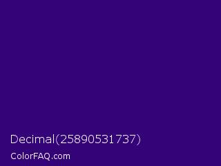 Decimal 25890531737 Color is a dark violet color and the nearest color is Blue Diamond #380474. Hex code #330377 and RGB value is rgb(51,3,119). In RGB color space, this color is composed of 20% red, 1% green, 47% blue, In CMYK color space, this color is composed of 57% cyan, 97% magenta, 0% yellow , 53% black , In HSL color space, this color has a hue angle of 265° , 95% saturation and 24% lightness.