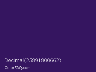 Decimal 25891800662 Color is a dark violet color and the nearest color is Jagger #350e57. Hex code #351560 and RGB value is rgb(53,21,96). In RGB color space, this color is composed of 21% red, 8% green, 38% blue, In CMYK color space, this color is composed of 45% cyan, 78% magenta, 0% yellow , 62% black , In HSL color space, this color has a hue angle of 266° , 64% saturation and 23% lightness.