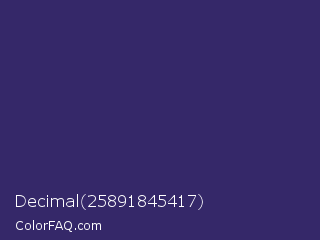 Decimal 25891845417 Color is a dark indigo color and the nearest color is Jacarta #3a2a6a. Hex code #352869 and RGB value is rgb(53,40,105). In RGB color space, this color is composed of 21% red, 16% green, 41% blue, In CMYK color space, this color is composed of 50% cyan, 62% magenta, 0% yellow , 59% black , In HSL color space, this color has a hue angle of 252° , 45% saturation and 28% lightness.