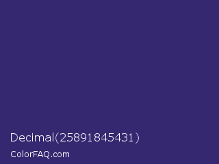 Decimal 25891845431 Color is a dark indigo color and the nearest color is Jacarta #3a2a6a. Hex code #352871 and RGB value is rgb(53,40,113). In RGB color space, this color is composed of 21% red, 16% green, 44% blue, In CMYK color space, this color is composed of 53% cyan, 65% magenta, 0% yellow , 56% black , In HSL color space, this color has a hue angle of 251° , 48% saturation and 30% lightness.